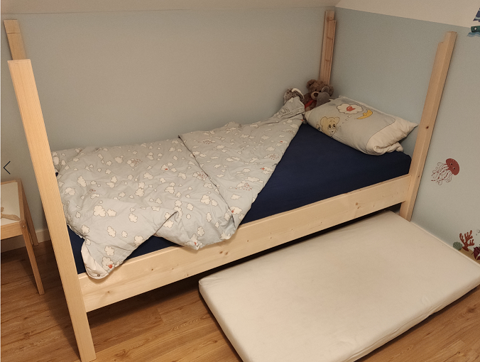 Und damit ging es dann für unseren Kleinen in die erste Nacht. Rausfallschutz war vorerst eine Matratze auf dem Boden … Um einen Rausfallschutz haben wir uns den Tag darauf gekümmert. Hierzu haben wir den 5ten 60x60cm Pfosten verwendet und dadurch einen “Eingang” ins Bett kreiert. Dies ist auf den nachfolgenden Bildern zu sehen.